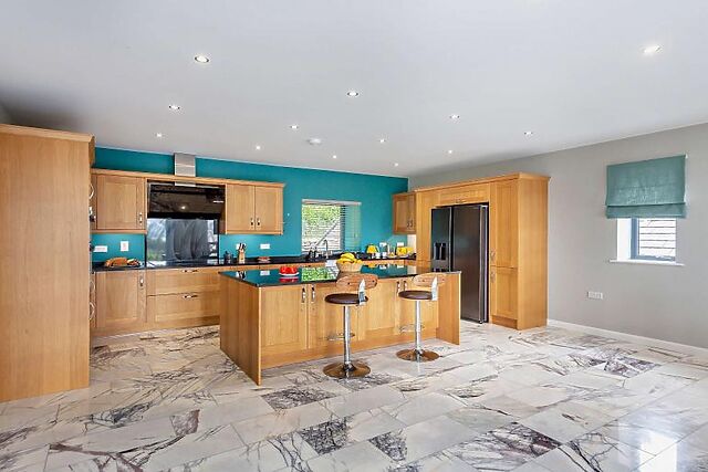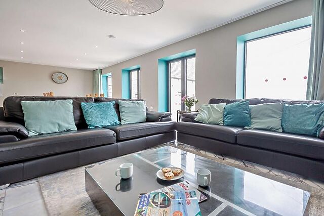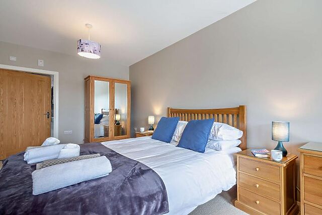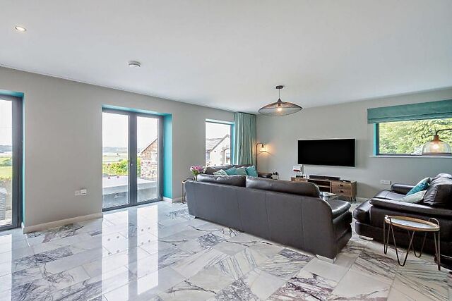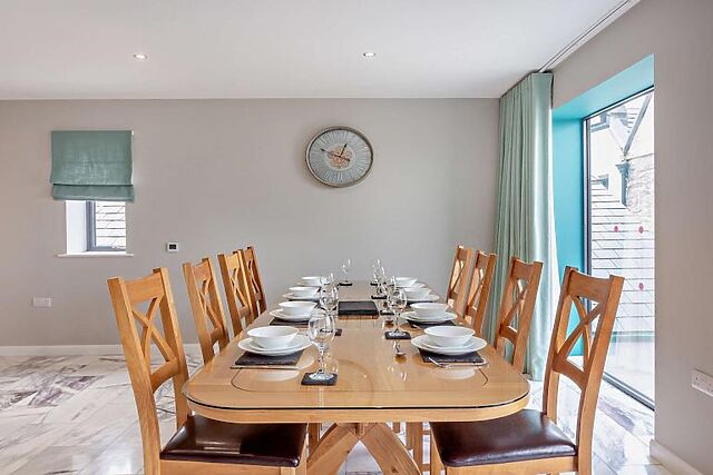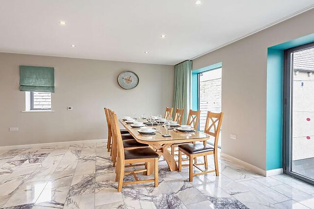 Comfortable seating is arranged before a Smart TV in the lounge area, the dining suite has seating for eight, and the kitchen is well-equipped and includes an island unit with bar-style seating, plus wonderful underfloor heating. A cloakroom adds convenience to the first-floor layout.