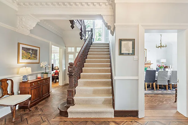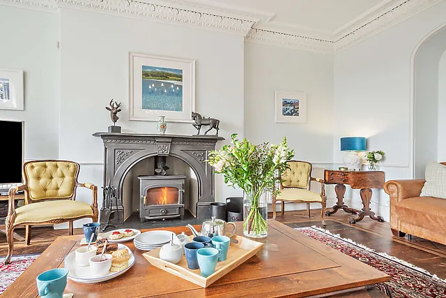The property boasts a range of period features, including ornate plasterwork and original hardwood flooring, complemented by modern amenities such as a hot tub, perfect for stargazing or soaking in the serene landscape.