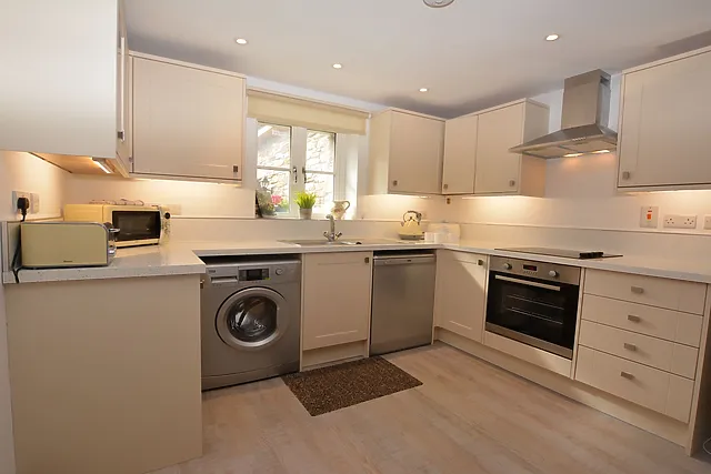 Inside, you'll find a bright, contemporary open-plan living space with a modern kitchen, a dining area beneath a stylish pendant lamp, and a cosy lounge with a log effect electric fire and Smart TV. The property is equipped with all the contemporary appliances you could need.