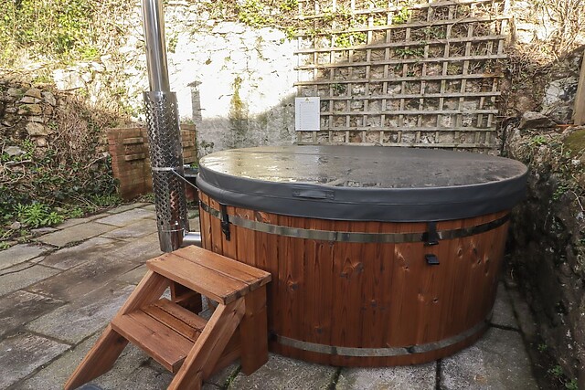 The chic baby pink kitchen is fully equipped for preparing delicious meals, while the utility room with a washer/dryer ensures that your clothes stay fresh and clean throughout your stay. Step outside into the enclosed, multi-level garden, complete with a patio providing the perfect spot for enjoying the fresh sea air and soaking in the warmth of the tub.