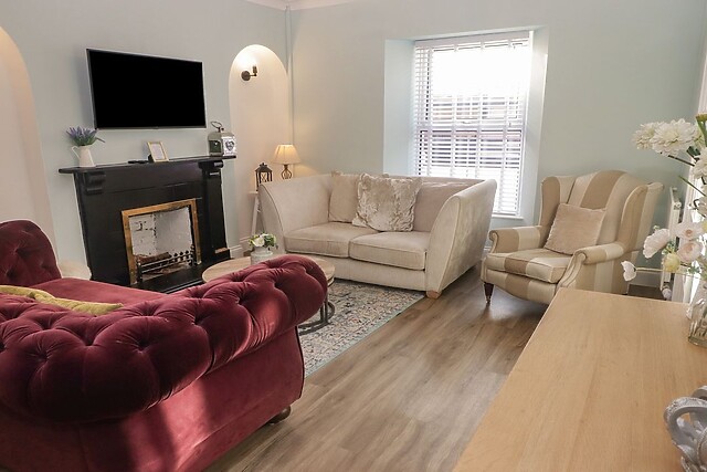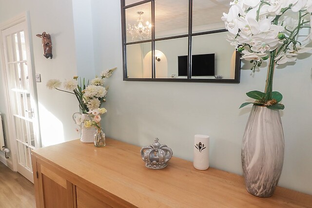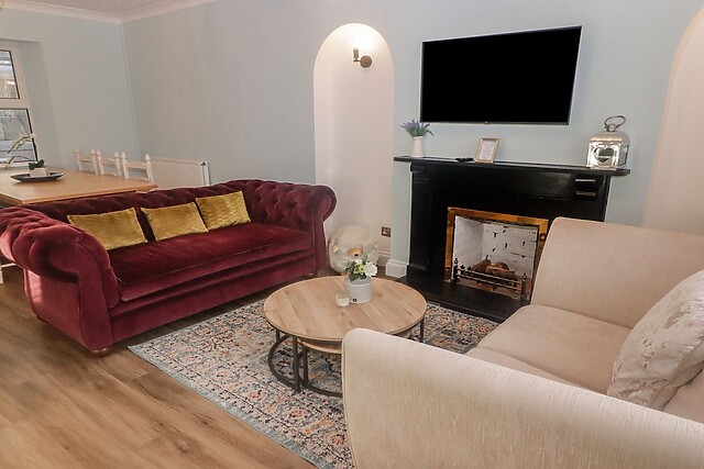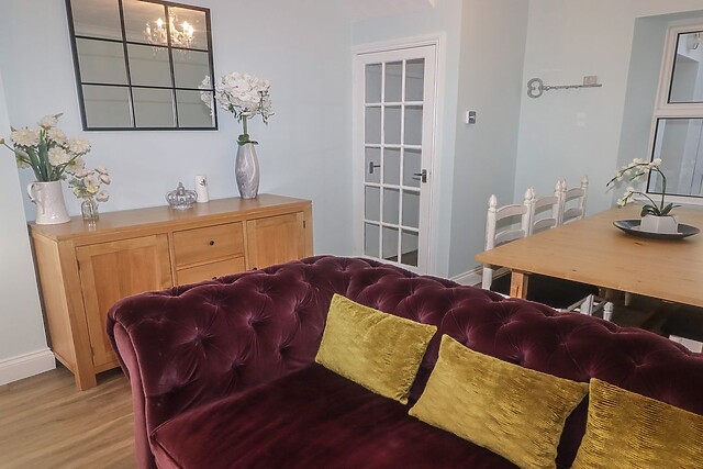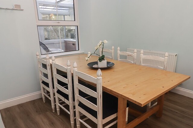 Inside, the sitting room is an inviting retreat featuring a feature fireplace and a colourful Chesterfield sofa where you can relax and unwind in comfort. Gather together in the dining room, which offers seating for six guests and a bench for two more, perfect for enjoying meals together or playing games on rainy days.