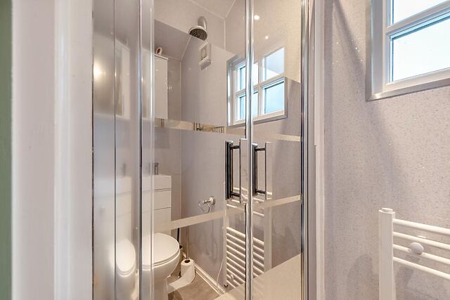 There is also a handy two-seater bistro set for more formal meals. Through here is a stylish shower room with a WC.