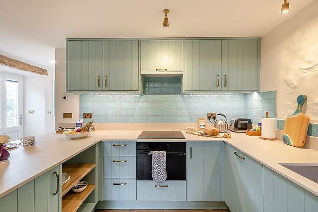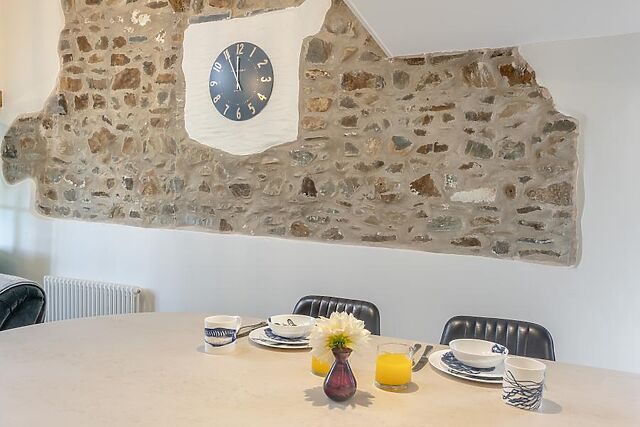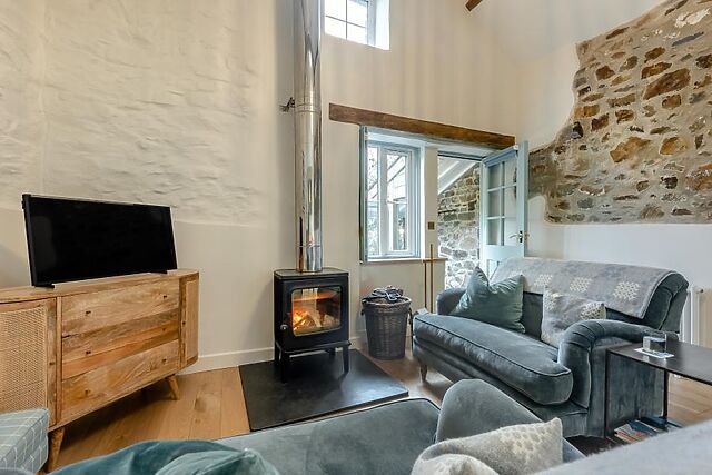 Stepping into this delightful and spacious holiday home, you will find a cosy living room with high ceilings, original beams and a central wood burner that glows against the exposed brick on an evening. Settle in front of the Smart TV for a film, or step into the handmade kitchen just behind to whip up a hearty Welsh feast.