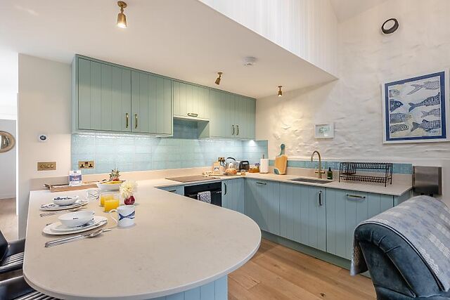 The breakfast bar functions as a table for two, whether you're planning adventures over food or playing rounds of cards long into the evening. Along the hall, the seaside-themed bathroom features a free-standing bath and walk-in shower.