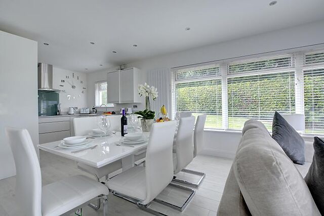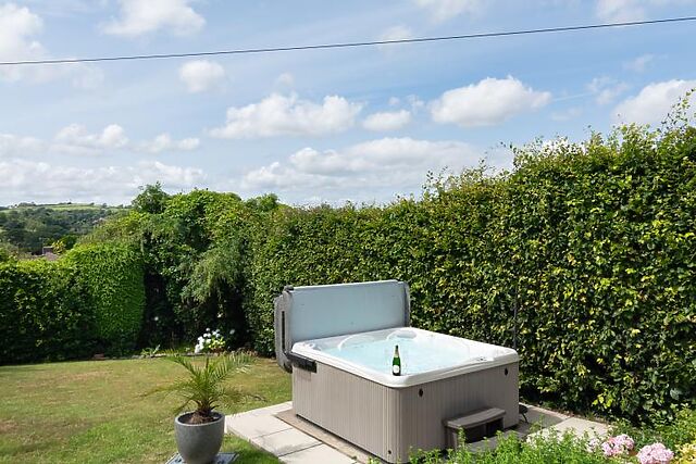 The property boasts a modern open-plan living area with chic interiors and a private garden featuring a hot tub for ultimate relaxation.