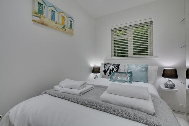 The spacious living room, kitchen, and dining area are perfect for socialising. Large windows and patio doors flood the space with light, creating a bright and welcoming atmosphere. The kitchen is fully equipped with high-end appliances, ensuring you have everything needed for a comfortable stay.