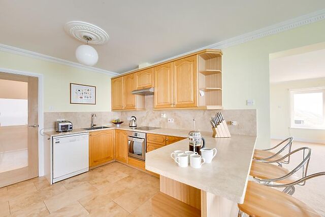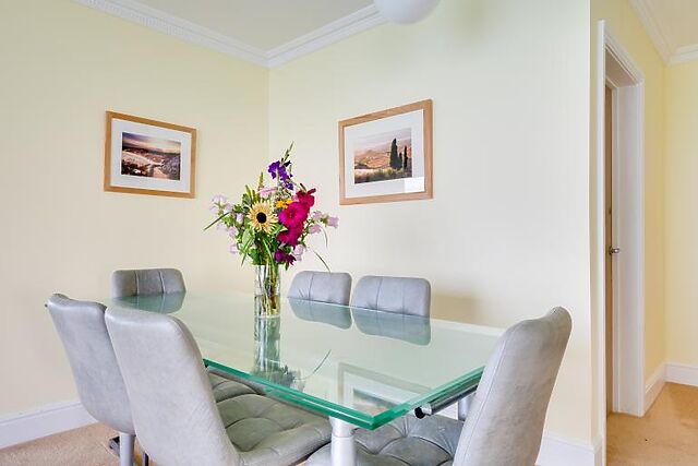 The kitchen is well-equipped with modern appliances, including an electric oven, hob, microwave, fridge/freezer, and dishwasher. The dining area seats six, making it ideal for intimate meals with family or friends.