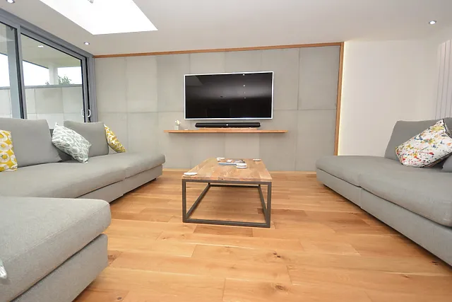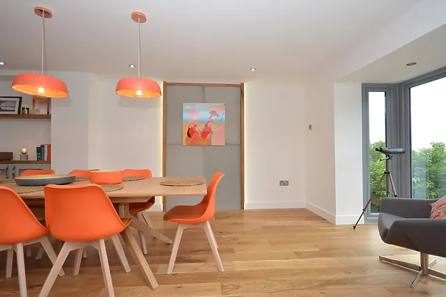 The open-plan living area on the first floor offers panoramic views of the bay, seamlessly blending the lounge, kitchen, and dining spaces, leading out onto a spacious balcony.