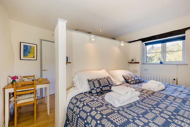 The dining table, situated to the right of the room, provides a cosy setting for two. When you're ready to turn in for the night, head to the left of the divider to discover a delightful super-king-size bed with a sumptuous mattress and duvet.