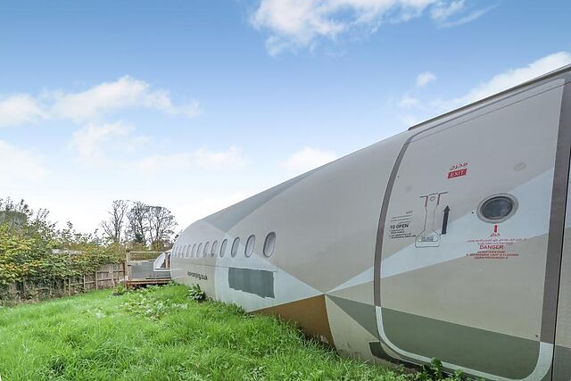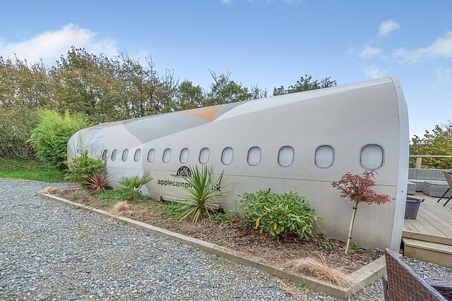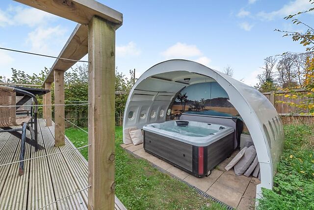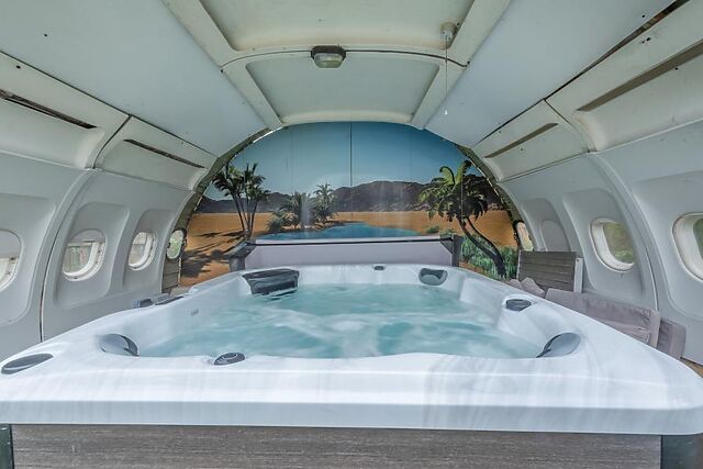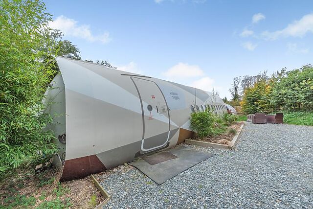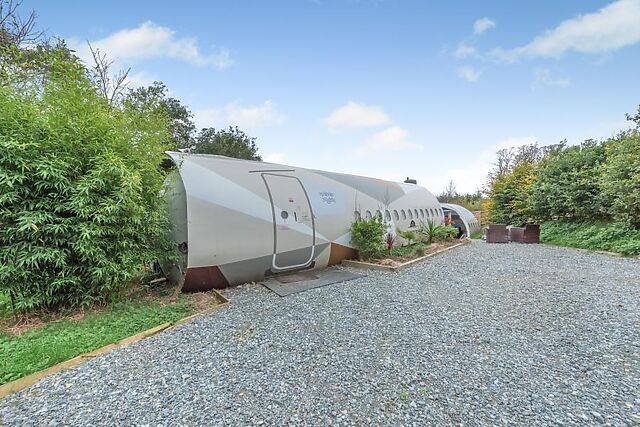 A lovely, decked patio area has seating, while a second seating area is sheltered with another fuselage, and contains a bubbling hot tub. There is parking available for one car.