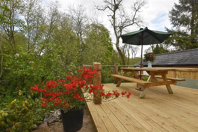 There is a charming decked area with a picnic table, bench seating, and sun shade, overlooking the mill brook, offering a peaceful outdoor space for guests.