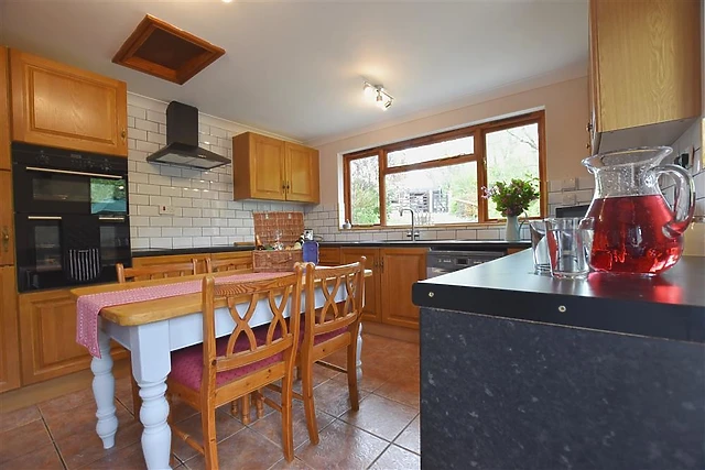 The kitchen is fully equipped with modern appliances, including a double oven, hob, microwave, fridge/freezer, washing machine, and dishwasher, catering to all your culinary needs.