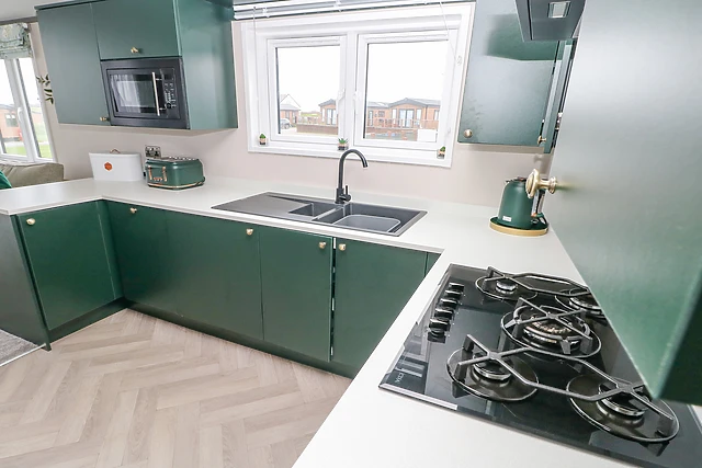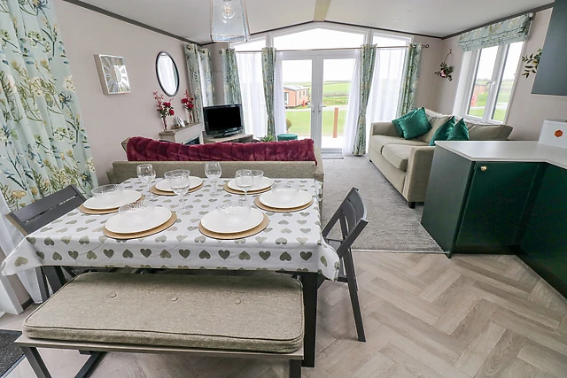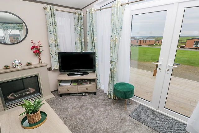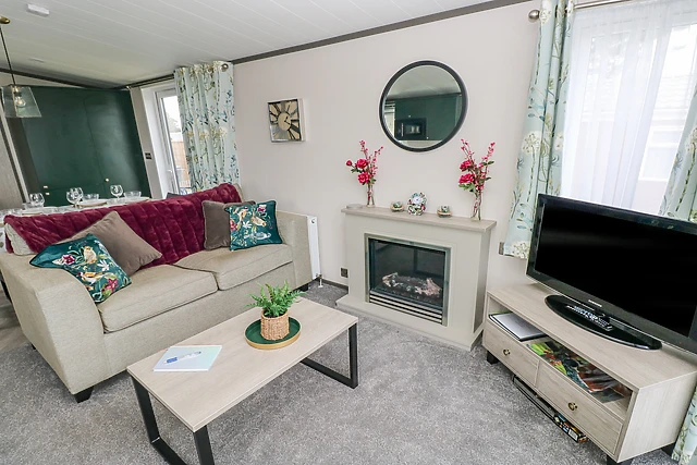 The lodge's open-plan living space, complete with a Flame effect Electric Fire, provides a warm and inviting atmosphere for evenings spent unwinding.