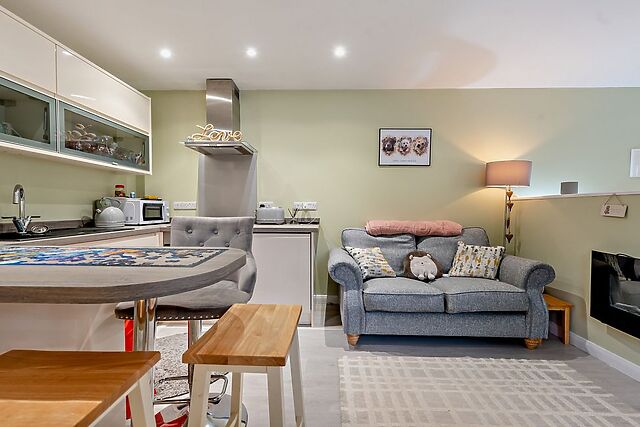 It features a double bed, limited but functional kitchen facilities, and a level-access shower room with a WC and sink basin. This space is ideal for guests with mobility issues, offering step-free access and a low-threshold patio or bi-fold door entry at the rear with the addition of it's own separate front / side door directly off the drive way which does have one step access.