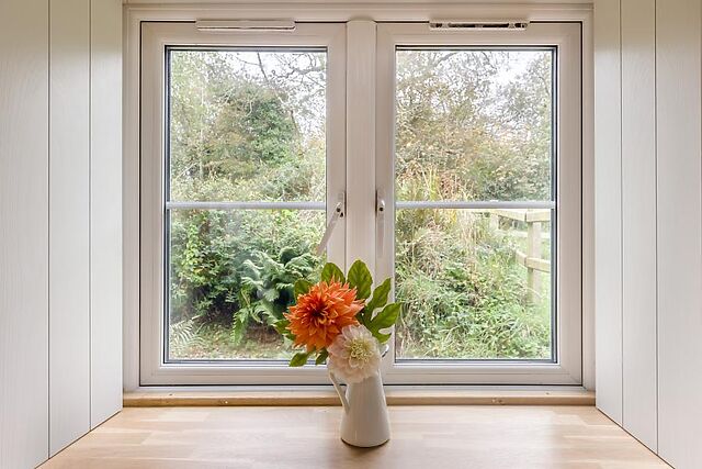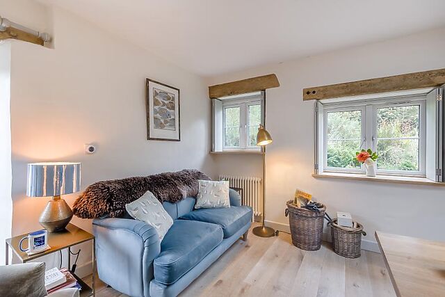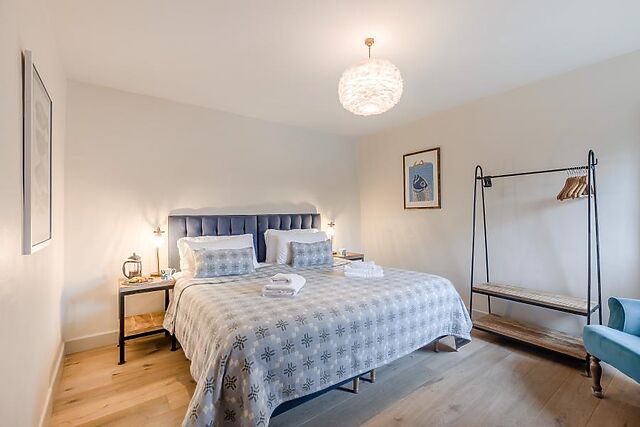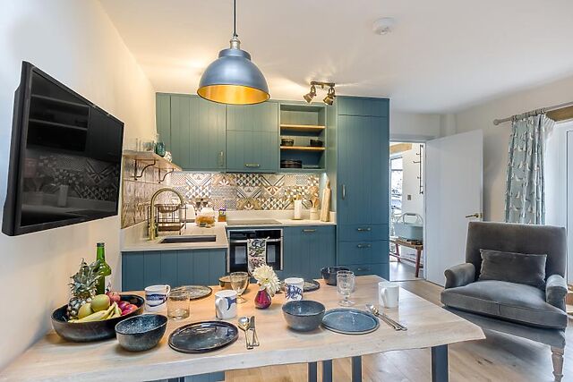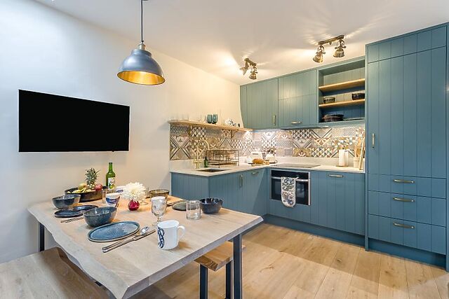When stomachs rumble, a vibrant and well-appointed kitchen boasts everything needed for a self-catered stay, including a modern dining table with low bench seating. Down the hallway, a smart and accessible shower room serves the two restful bedrooms: a super-king-size room that converts to twins on request, and a cosy twin bedroom.