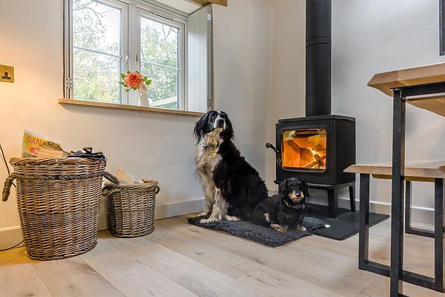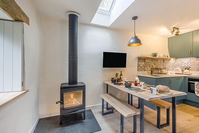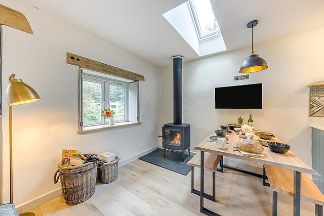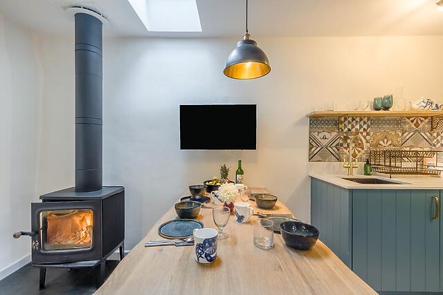 A chic, light and airy, open-plan living space greets you, combining the lounge, kitchen and diner in one stylish room. After days of outdoor adventures, retreat to the lounge area’s soft seating arranged around a Smart TV and roaring wood burner – perfect for cosy movie nights.