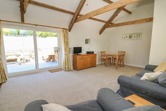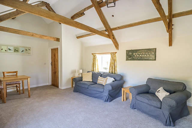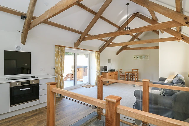 The open-plan living space exudes warmth and character, boasting exposed oak beams and a well-equipped kitchen for home-cooked meals.