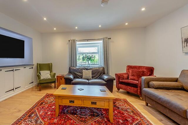 The impressive entrance hall leads to the first of two cosy lounges, where plush sofas and a Smart TV provide the perfect spot to unwind. For family meals, the country-style kitchen is fully equipped to handle group catering, with the adjoining dining room offering ample space to gather.