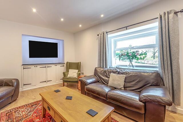 Two family bathrooms and a sofa bed in the small lounge ensure convenience for all. Outside, the heated, all-weather swimming pool and private hot tub promise hours of relaxation, while the garden’s sheltered seating area—complete with a BBQ, pizza oven, outdoor bar, and Smart TV—sets the stage for al fresco dining.