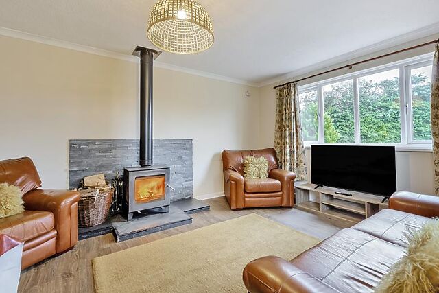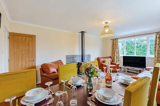 The cosy lounge is the perfect place to unwind, complete with a new log-burning stove for added warmth and ambience. The well-equipped kitchen includes a breakfast bar, dishwasher, and fridge freezer, ideal for self-catering stays.