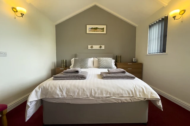 The bedroom is a haven of comfort, boasting a king-size bed and an en-suite bathroom with a walk-in shower.