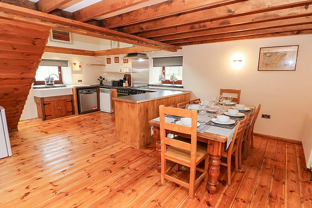 After a long day of exploring the coast, you will be delighted to settle down in the sitting area, where the first-floor mezzanine adds a light and airy feel, with traditional features including bare-brick walls and wooden beams threaded throughout a cathedral, making this an ideal spot to snuggle up for a movie night. When mealtimes call, a superb kitchen awaits, stocked with loads of home-from-home amenities, including a large range oven adding a farmhouse feel, and you can enjoy a heart-warming meal in the dining area.