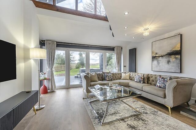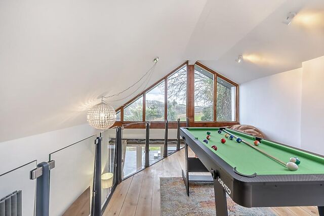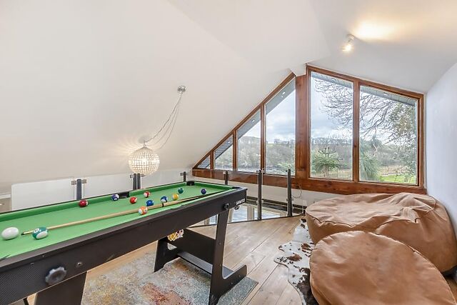Step into the spacious lounge, where plush seating, a Smart TV, and a wood burner set the scene for cosy evenings. For added entertainment, head up the striking spiral staircase to the mezzanine games room, where you can play pool or relax in the snug.