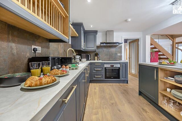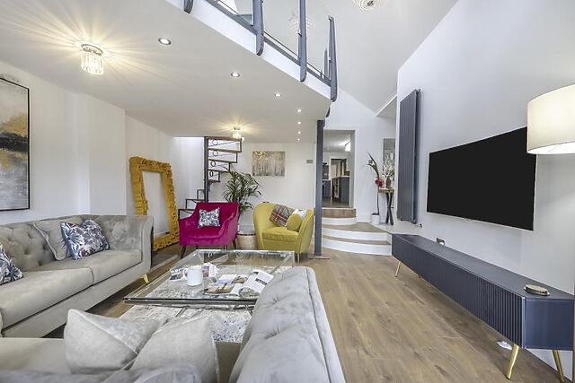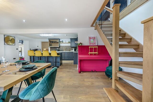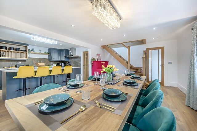 The open-plan kitchen/diner is a show-stopper, with a sleek, bespoke kitchen, a generous breakfast bar, and a dining table that comfortably seats ten – perfect for memorable meals and lively gatherings. A handy utility room off the kitchen provides access to a private courtyard.