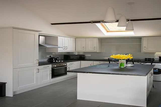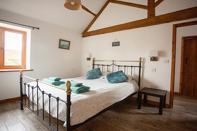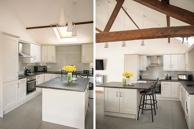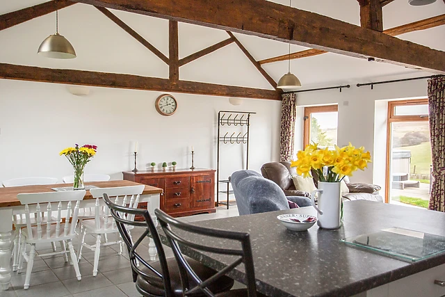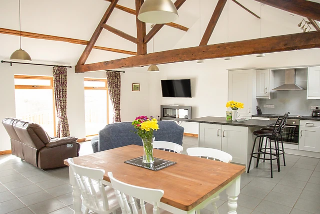 Arrive at the front door and take one more look at the incredible hill views before heading into the wonderful open-plan living room, the exposed wooden beams, comfortable leather seating in front of the TV and modern electric fire and the well-equipped kitchen/dining area make this room perfect for relaxing day and night. The rustic wooden latch doors contrast beautifully with the contemporary features to make a homely stay for everybody to enjoy.