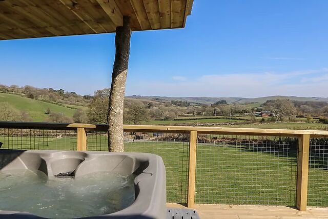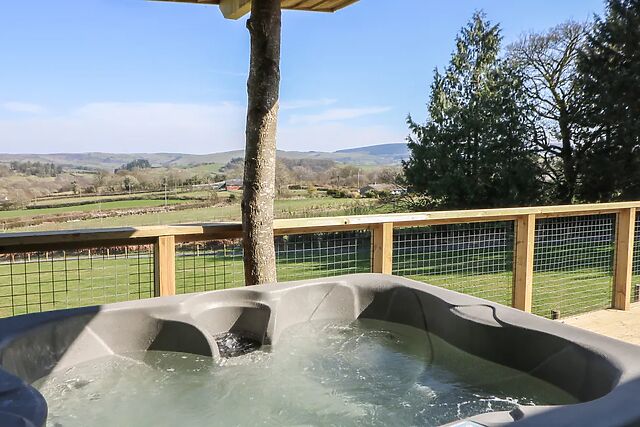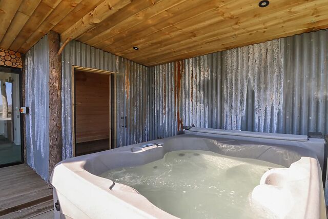 The decking area is furnished and includes an indulgent hot tub, sheltered for your privacy. A rustic log wall adds a touch of charm to the space and you will also have access to your own private steam sauna, perfect for unwinding after a day of adventures.