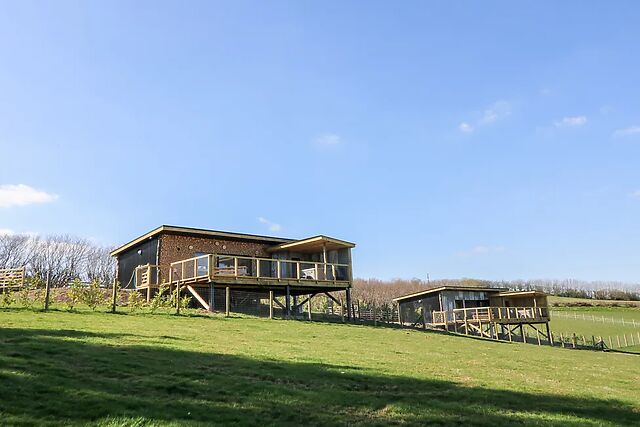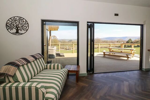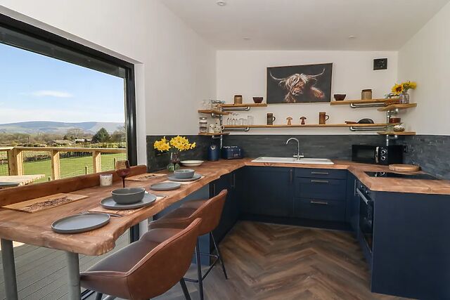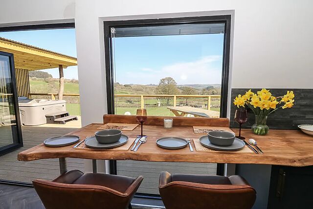 With its elevated position offering stunning countryside views, this delightful retreat features WiFi, off-road parking for two cars, an infra red sauna, hot tub and welcomes two well-behaved pets, making it perfect for couples seeking a romantic and serene escape. Park the cars and walk up the steps to the sleek black and wood-clad lodge.