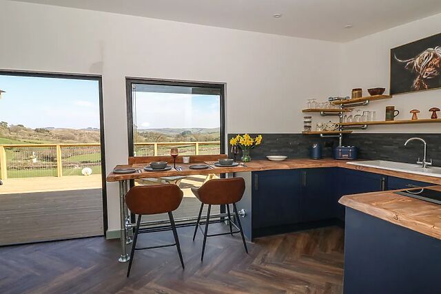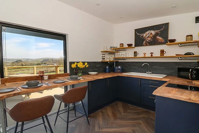 The open-plan living area houses a well-equipped kitchen, perfect for conjuring up romantic meals for two and a dining area with seating for two guests. Enjoy your morning coffee at the breakfast bar, taking in the stunning views through the window.