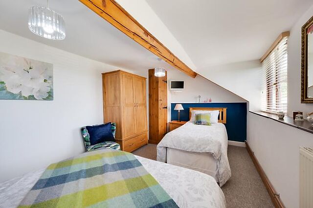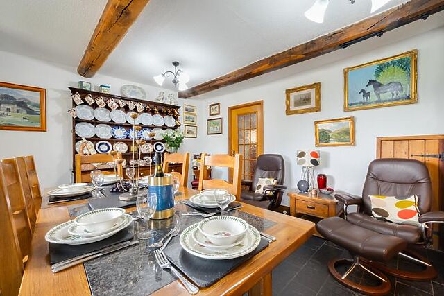 One of the highlights of Bryncylla is its luxury hot tub, perfect for unwinding while soaking in the stunning countryside views. The farmhouse features a lounge with a wood burner, a snug with a sofa bed, and a conservatory with lovely garden views. The dining room, with its exposed beams and slate floor, adds to the farmhouse's rustic charm.