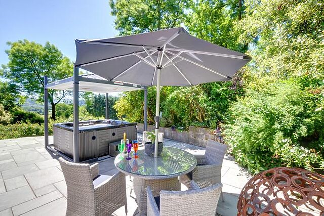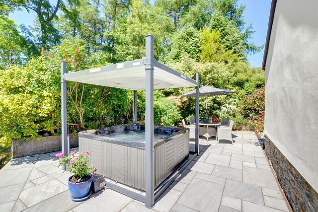The farmhouse is surrounded by paddocks and woodlands, with landscaped gardens and a patio area for outdoor dining. The raised patio to the side houses the hot tub, complete with mood lighting and additional seating.