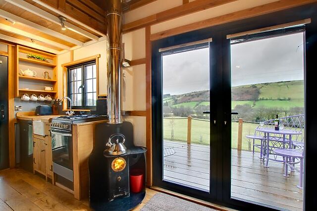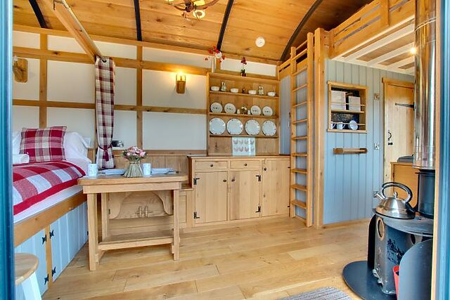 Inside, you'll find a cosy open-plan living area with a compact wooden kitchen, a fold-away dining area, and a wood burner.