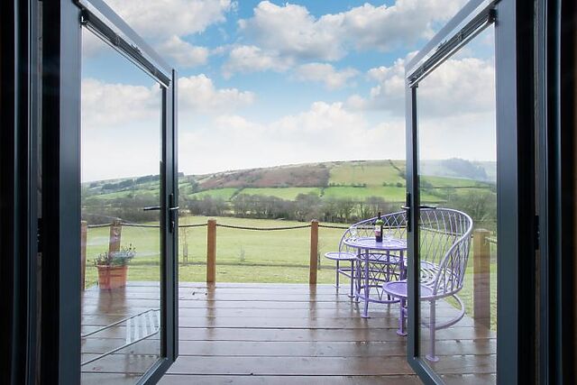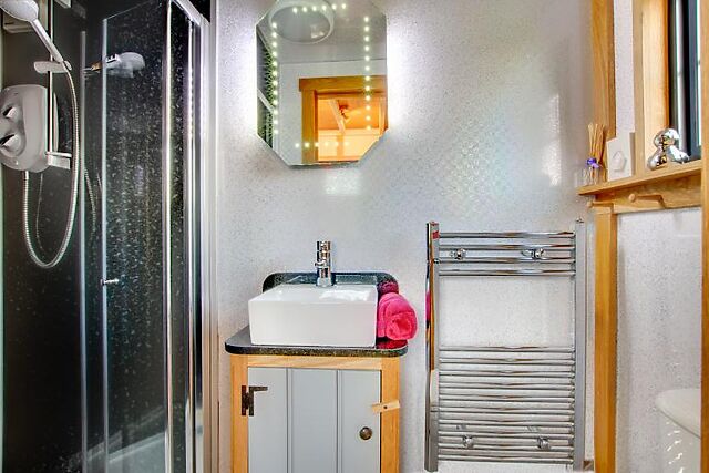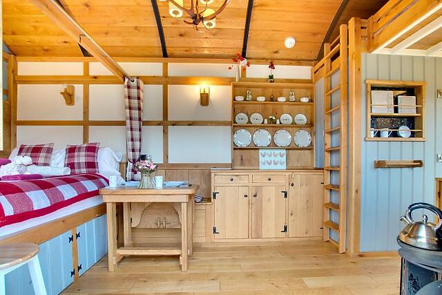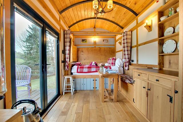 The handcrafted wooden bed offers uninterrupted country views, and the modern shower room ensures comfort. The cabin is designed to make the most of its space, offering a warm and inviting atmosphere.