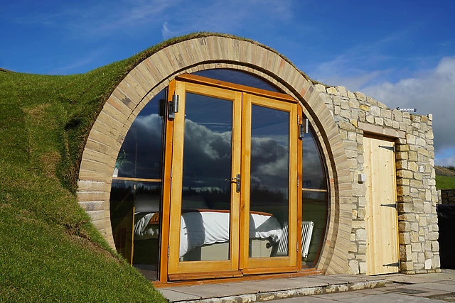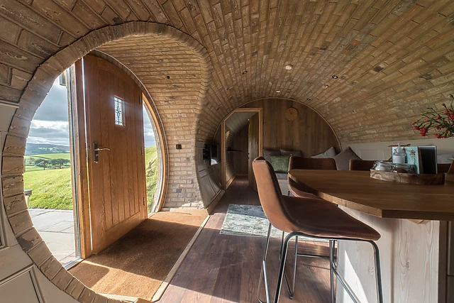 Tucked in pristine hillside gazing out upon rolling farmland across the breathtaking Elan Valley, near Rhayader in Powys, you will find the three-bedroom holiday hut of Hares View. With a whimsical facade featuring a large, round entrance, a well-appointed interior with wooden and brick décor, along with fantastic facilities including outdoor seating, a fire pit, and a hot tub, this delightful dwelling is a perfect base for a family or group of friends, as well as Tolkien fans, looking for a unique escape to gorgeous, rural Wales.