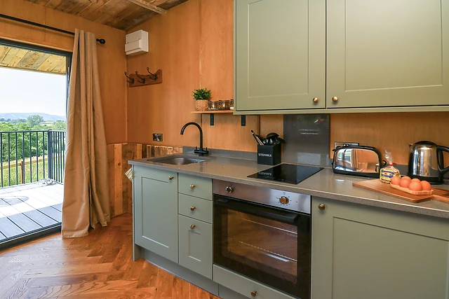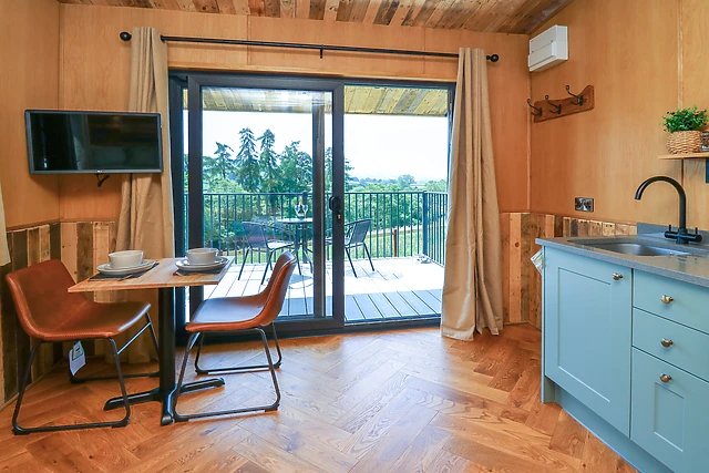 Upon arrival, ascend the steps to the decking and enter the studio-style living area. The cabin boasts a kitchen area equipped with an electric oven and hob, and a dining table for two, allowing you to prepare and enjoy your favourite meals while planning your adventures.
