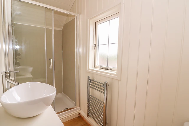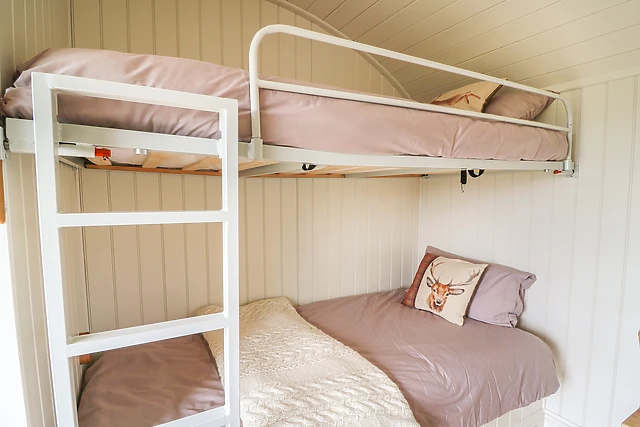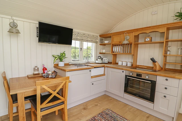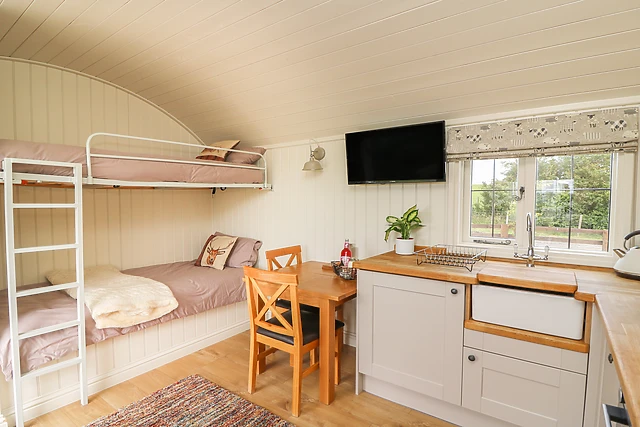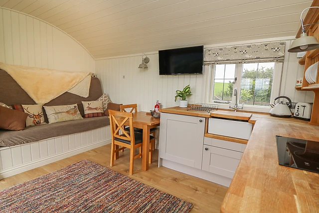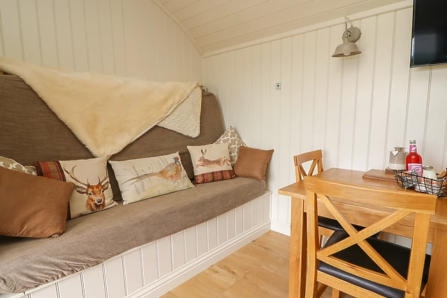 The open plan living area provides a comfortable bench sofa where you can relax in front of the TV and a well equipped kitchen and compact dining area, with the sofa converting into an ingenious bunk bed. The shower room is compact and well designed, like the rest of the hut, to maximise space and provide all the home comforts you need.