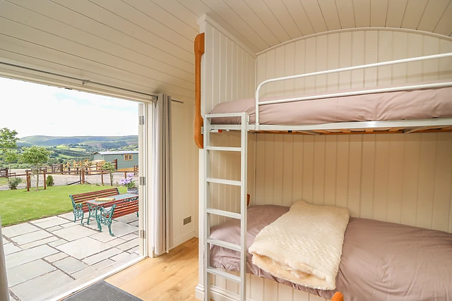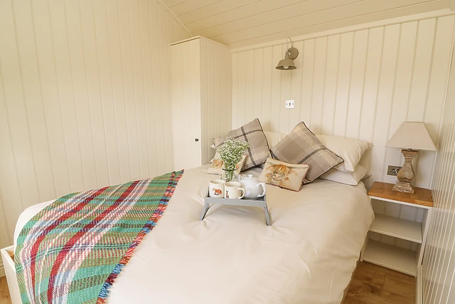 The master double room gives this shepherds hut a feeling of space and added luxury with the awe inspiring hillside views. The shepherds hut is set in a private enclosed garden, where the dog and children can use up any remaining energy at the end of the day, whilst you sit and enjoy a cool drink as the sun goes down or perhaps slip into the enticing hot tub and soak in the views.