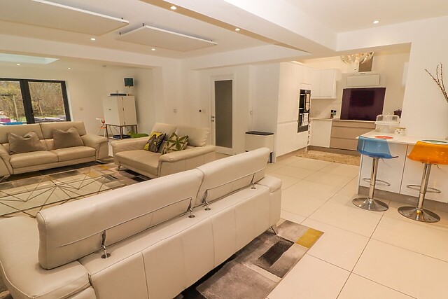 The heart of the home is the open-plan kitchen, dining, and sitting area—a bright and stylish space with plenty of seating for relaxation. Whether you're unwinding with a film, enjoying pancakes at the breakfast bar, or gathering around the dining table for a grand family meal prepared by the household chef, this area caters to all.