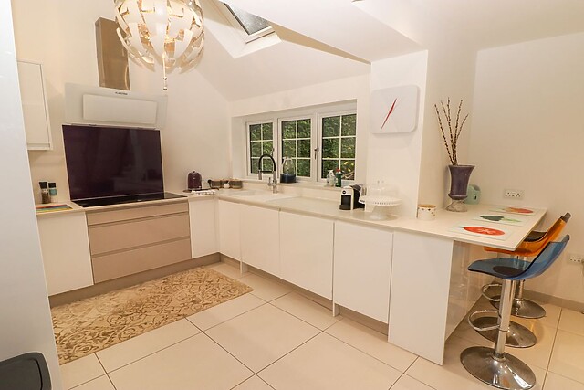 The kitchen includes amenities to make your stay smoother, such as a double oven and coffee maker, while the skylight in the dining area offers the chance to gaze at the stars on a clear night. On the ground floor, there’s a bedroom with a glass door, providing the perfect view of the garden to wake up to in the morning, as well as a convenient ground-floor shower room making it an ideal base for those with limited mobility.