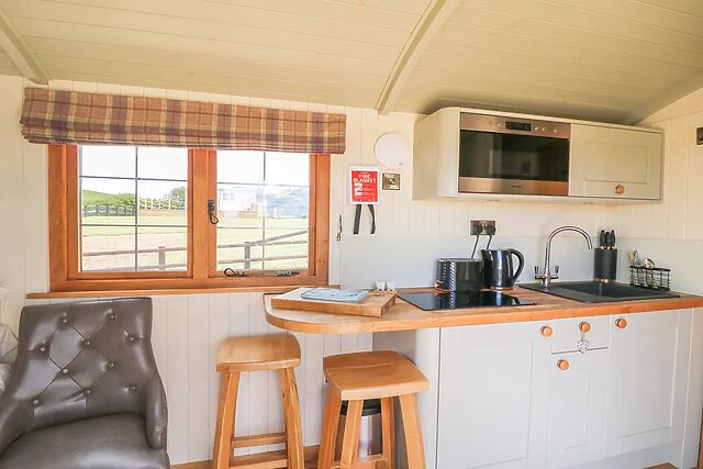 The double bed, offers fabulous countryside views through the patio doors across the raised decking adding to the feeling of seclusion and being surrounded by countryside. This delightful shepherd’s hut is on the edge of the owners farmland with a private enclosed garden, an ideal place to relax and watch the local wildlife and stargaze after the sun has gone done or perhaps relax in the warm waters of the hot tub.