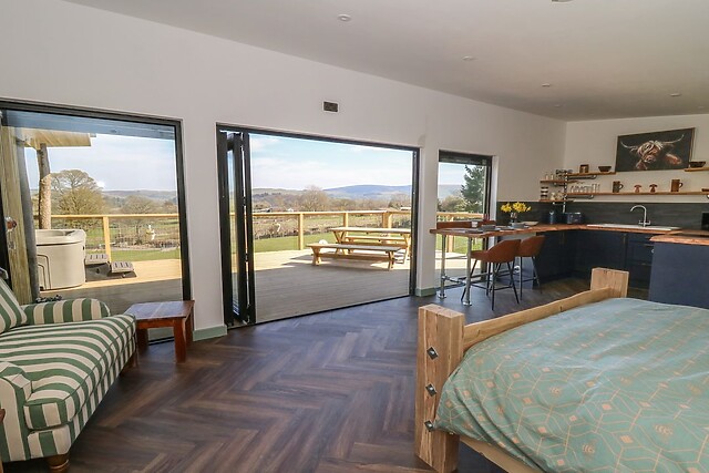 Offering stunning countryside views, a hot tub, a toasty infra red sauna and off-road parking for two cars, this pet-friendly retreat is perfect for a romantic getaway for couples or a tranquil retreat for a solo traveller. Park the cars outside this sleek black and wooden lodge and upon entering the property, you'll be greeted by a studio-style layout, where you can snuggle up on the sofa with your loved one and enjoy a movie marathon.