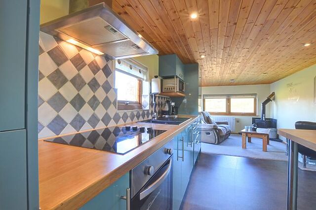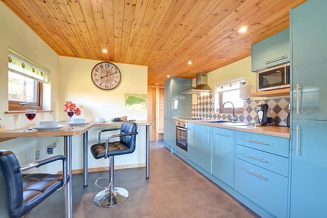 Inside, you'll find a stylish and contemporary interior that creates a homely atmosphere. The open-plan living area features a comfortable two-seater sofa and a TV, perfect for relaxing evenings. The kitchen is small but well-equipped, with attractive blue units and a breakfast bar with two stools.