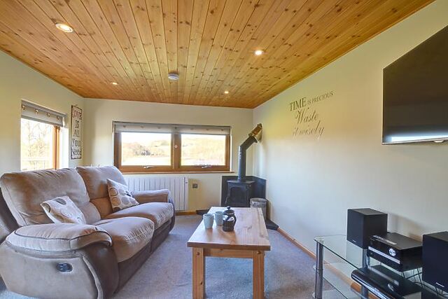 Step outside to the raised decking area, where you can enjoy the hot tub under the stars. The large fenced lawn with a picnic table is ideal for alfresco meals, and the 10 acres of shared land are perfect for walking and fishing.