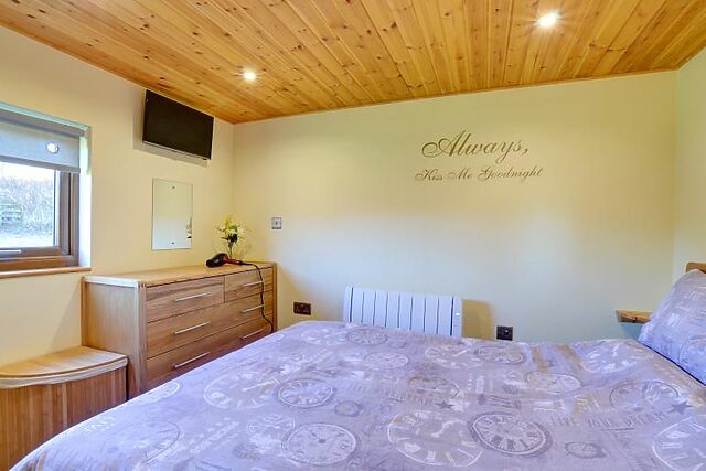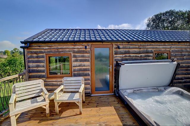 The cosy bedroom is furnished with wooden furniture, and the shower room includes a walk-in shower. Step outside to the raised decking area, where you can enjoy the hot tub under the stars.