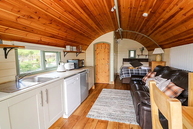 Step up onto the small, lit-up veranda and walk through the stylish circular doorway and enter yourself into this unique open plan living area. Despite being small in size, this cabin manages to fit all of the equipment and furnishings needed for a holiday in the countryside.