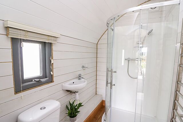 The compact kitchen area is well-equipped and finished with pristine, white fixtures and fittings. To the back of the lodge cosily rests the double bed, also looking out towards the picturesque Rhayader countryside, the perfect sight to wake up to.