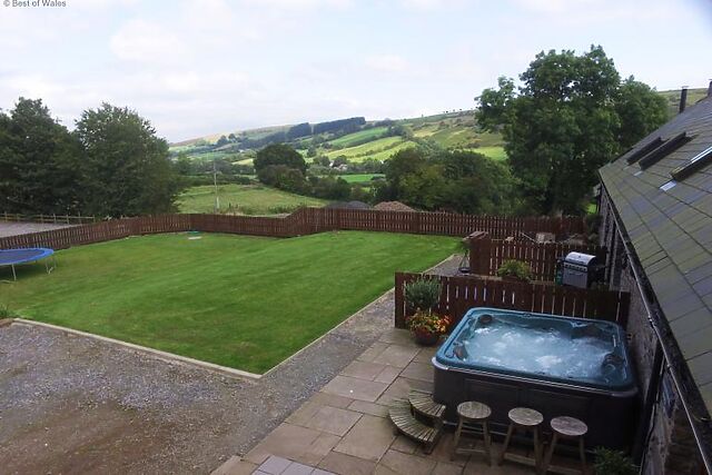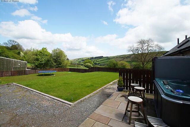 Outside, the property offers a large lawned area with a trampoline, a patio with tables, chairs, and a charcoal BBQ, perfect for outdoor dining. Relax in the hot tub while enjoying the lovely countryside views.